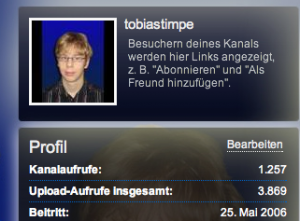 Ich will mich an dieser Stelle mal bei meinen Zuschauern für 4154 Videoaufrufe, 1257 Kanalaufrufe und 23 Abonnenten bedanken. Btw., im bild sind nur 3869 Aufrufe zu sehen, was daran liegt, dass ein Video von mir aus irgendeinem Grund entfernt wurde. Und falls ihr es noch nicht getan habt, abonniert bitte meine Videos unter http://youtube.com/tobiastimpe